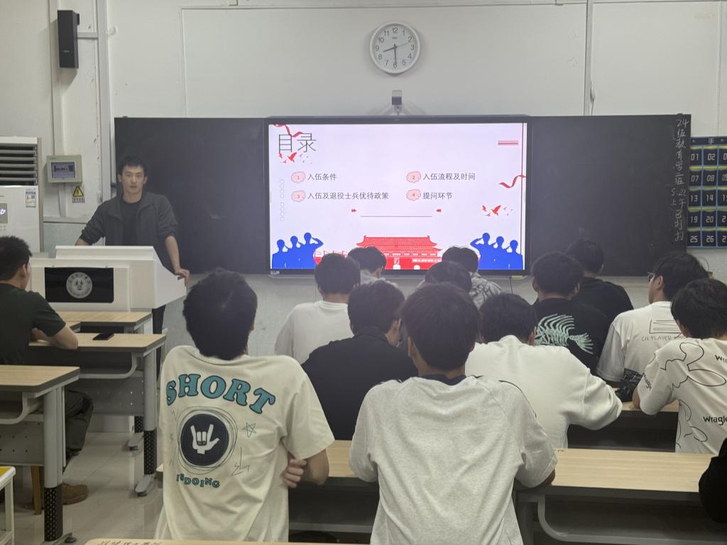 5月22日,文学与传媒学院退役士兵刘可龙、刘宸宇面向我院2025届毕业班全体男生开展“2025年秋季征兵计划”专题宣讲会,活动旨在深入贯彻落实国家征兵政策,鼓励青年学子投身国防事业,为军队现代化建设贡献青春力量。活动由辅导员杨辰晖老师主持。
