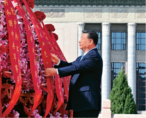 2025年9月30日上午,党和国家领导人习近平、李强、赵乐际、王沪宁、蔡奇、丁薛祥、李希、韩正等来到北京天安门广场,出席烈士 纪念日向人民英雄敬献花篮仪式。这是习近平整理花篮上的缎带。